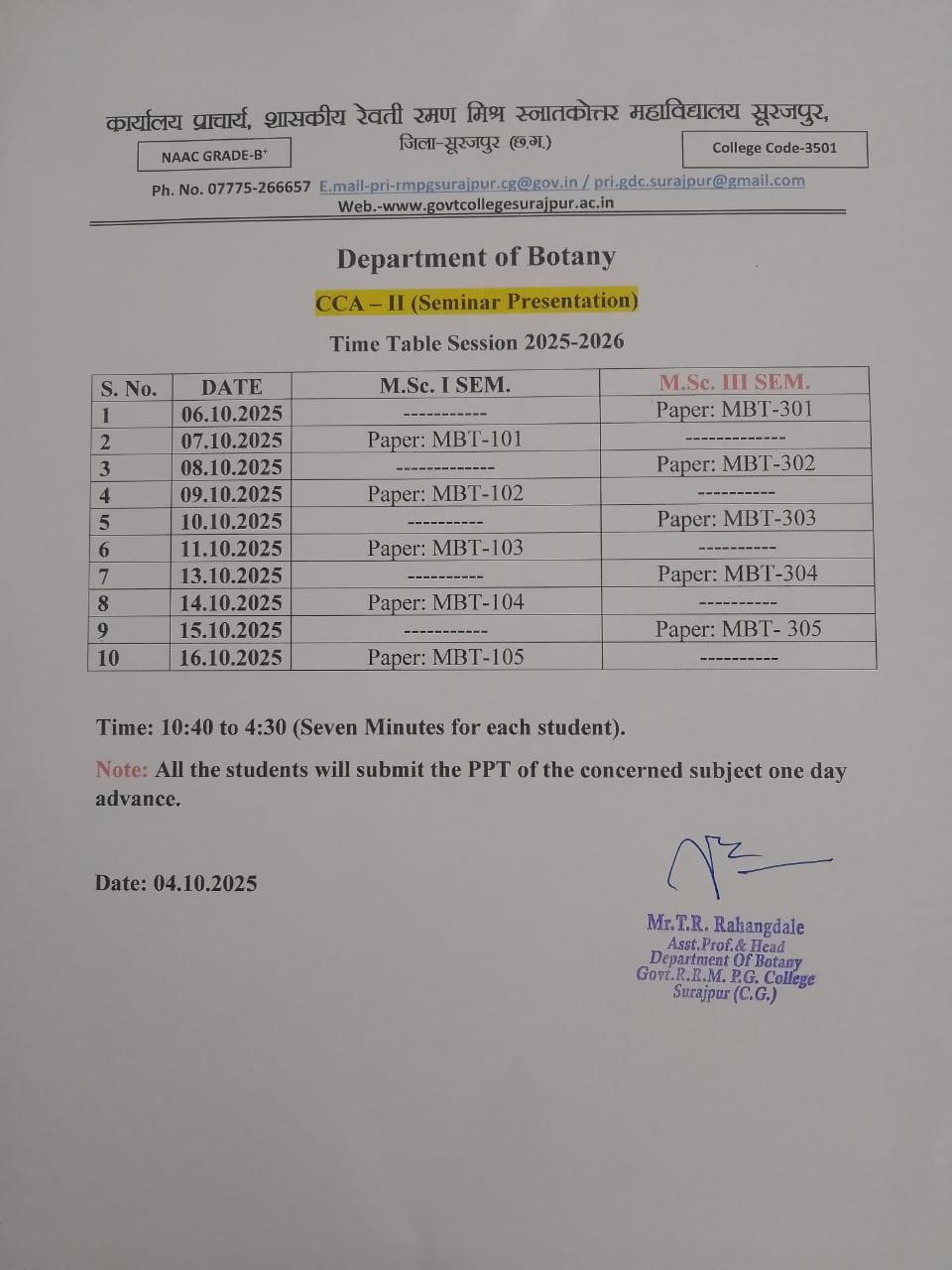 शासकीय रेवती रमण मिश्र स्नातकोत्तर महाविद्यालय सूरजपुर में एमएससी प्रथम एवं तृतीय सेमेस्टर वनस्पति शास्त्र विषय के विद्यार्थियों ने अपना सेमिनार संपन्न किया। यह सेमिनार विश्वविद्यालय के CBCS के अनुसार आयोजित किया जाता है। यह CCA-II मूल्यांकन का एक भाग है। इसमें सभी विद्यार्थियों को व्यक्तित्व विकास के लिए विषय प्रदान किए जाते हैं, और प्रत्येक विद्यार्थी उन विषयों पर अपना PPT तैयार कर सभी के समक्ष प्रस्तुत करते हैं, इससे विद्यार्थियों में विषय की समझ बढ़ती है तथा विद्यार्थियों में व्यक्तित्व का विकास होता है। यह सेमिनार दिनांक 6 अक्टूबर 2025 से 16 अक्टूबर 2025 तक आयोजित किया गया। सभी विद्यार्थियों में व्यक्तित्व में परिवर्तन देखा गया जो विद्यार्थी मंच पर खड़े होकर अपनी बातें प्रस्तुत नहीं कर पाते थे वह भी कुशलता से अपने विषय पर व्याख्यान देने में सफल रहे हैं। सेमिनार का मूल्यांकन वनस्पति शास्त्र के विभाग अध्यक्ष श्री टी.आर. राहंगडाले तथा कु. उज्जैनी किशोर द्वारा किया गया।