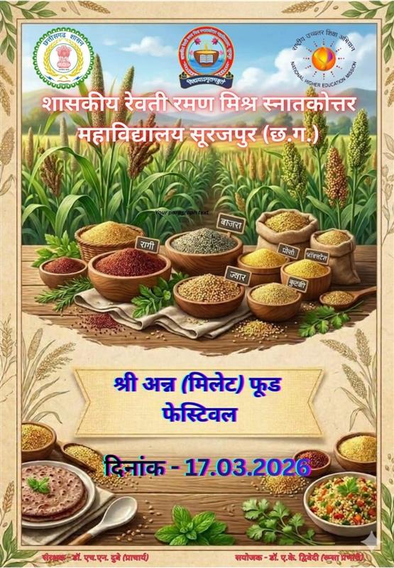 उच्च शिक्षा विभाग, छत्तीसगढ़ शासन के निर्देशानुसार एवं रूसा 2.0 के तत्वावधान में आज दिनांक 17.03.2026 को शासकीय रेवती रमण मिश्र स्नातकोत्तर महाविद्यालय सूरजपुर में अन्न फूड (मिलेट्स) फेस्टिवल का भव्य आयोजन किया गया। कार्यक्रम के मुख्य अतिथि संत गहिरा गुरू विश्वविद्यालय सरगुजा, अम्बिकापुर के कुलसचिव डॉ. एस.पी. त्रिपाठी रहे। फेस्टिवल के अंतर्गत महाविद्यालय के छात्र-छात्राओं ने मिलेट्स उत्पादों एवं मिलेट्स से निर्मित विविध खाद्य पदार्थों की आकर्षक प्रदर्शनी लगाई। मुख्य अतिथि डॉ. त्रिपाठी ने अपने उद्बोधन में बताया कि वे स्वयं अपने दैनिक जीवन में मिलेट्स का नियमित उपयोग करते हैं और आंध्रप्रदेश, राजस्थान, मध्यप्रदेश एवं छत्तीसगढ़ के किसानों से मिलकर इसके व्यापक प्रचार-प्रसार में सक्रिय रूप से जुटे हैं। उन्होंने कहा कि रासायनिक उर्वरकों एवं कीटनाशकों के दुष्प्रभाव से बचने के लिए मिलेट्स का उपयोग अत्यंत आवश्यक है, जो रोग प्रतिरोधक क्षमता बढ़ाकर अनेक बीमारियों से रक्षा करता है।