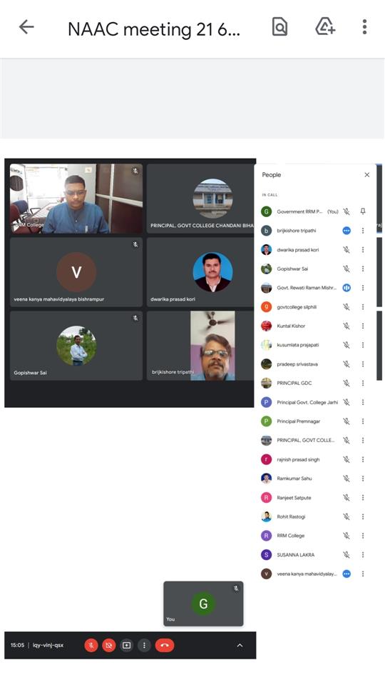 आज दिनांक 21.06.2021 को पूर्वाहन 3:00 बजे सूरजपुर नैक जिला स्तरीय बैठक SLQAC, रायपुर की तत्वाधान में पूर्ण की गई जिसकी अध्यक्षता महाविद्यालय के प्राचार्य डॉ एस.एस. अग्रवाल एवं संचालन आइक्यूएसी प्रभारी डॉ चंदन कुमार एवं नैक प्रभारी डॉ वी.के झा द्वारा की गई जिसमें सूरजपुर जिले के समस्त महाविद्यालयों के प्राचार्य, आइक्यूएसी व नैक प्रभारी उपस्थित रहे।