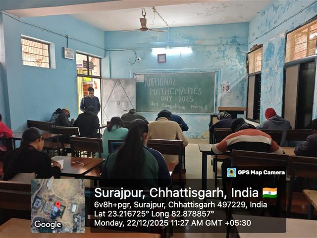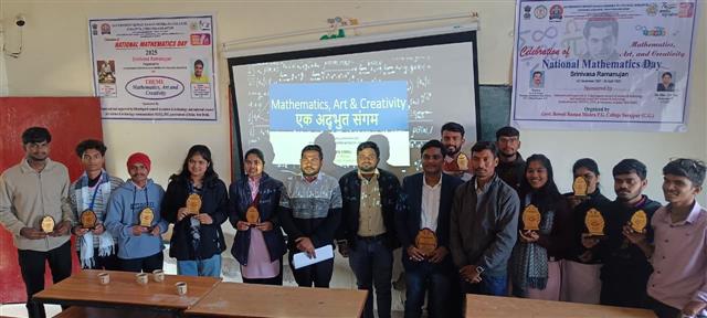 राष्ट्रीय गणित दिवस 2025 के अवसर पर शासकीय रेवती रमण मिश्र स्नातकोत्तर महाविद्यालय, सूरजपुर में 16, 17, 19 एवं 22 दिसंबर को “Mathematics, Art and Creativity” थीम पर आधारित चार दिवसीय शैक्षणिक एवं रचनात्मक कार्यक्रमों का आयोजन किया गया। यह कार्यक्रम छत्तीसगढ ़ प्रौद्योगिकी एवं विज्ञान परिषद रायपुर,राष्ट्रीय प्रौद्योगिकी एवं विज्ञान परिषद, डी. एस.टी.,भारत सरकार नई दिल्ली के सहयोग से आयोजित हुआ। इस कार्यक्रम का उद्देश्य भारत के महान गणितज्ञ श्रीनिवास रामानुजन के गणित में दिए अद्वितीय योगदान को स्मरण करने तथा विद्यार्थियों में गणित विषय के प्रति रुचि जागृत करना, उनकी तार्किक एवं विश्लेषणात्मक सोच को विकसित करना तथा गणित को कला और रचनात्मक अभिव्यक्ति से जोड़कर सरल एवं रोचक रूप में प्रस्तुत करना रहा। कार्यक्रम का आयोजन महाविद्यालय के प्राचार्य डॉ. एच. एन. दुबे के मार्गदर्शन एवं संरक्षण में किया गया। उद्घाटन अवसर पर अपने अध्यक्षीय उद्बोधन में डॉ. दुबे ने कहा कि गणित केवल संख्याओं और सूत्रों तक सीमित विषय नहीं है, बल्कि यह जीवन के प्रत्येक क्षेत्र में निर्णय क्षमता, अनुशासन और समस्या समाधान की नींव रखता है। ऐसे आयोजन विद्यार्थियों में नवाचार, कल्पनाशीलता और वैज्ञानिक दृष्टिकोण को प्रोत्साहित करते हैं।कार्यक्रम के दौरान मुख्य वक्ता उज्ज्वल विशाल ने मैथेमेटिक्स, आर्ट एंड क्रिएटिविटी विषय पर प्रभावशाली व्याख्यान प्रस्तुत किया। उन्होंने गणित और कला के अंतर्संबंधों को उदाहरणों के माध्यम से स्पष्ट करते हुए बताया कि गणितीय संरचनाएँ किस प्रकार चित्रकला, वास्तुकला, संगीत एवं डिज़ाइन में सौंदर्य और संतुलन उत्पन्न करती हैं। उनके प्रेरणादायक वक्तव्य से विद्यार्थियों में विषय के प्रति नई दृष्टि विकसित हुई।चार दिवसीय आयोजन के अंतर्गत विद्यार्थियों के लिए गणितीय मॉडल एवं पोस्टर प्रदर्शनी, गणित क्विज, भाषण प्रतियोगिता, गणितीय पहेलियाँ तथा विशेष व्याख्यान सत्र आयोजित किए गए। इन गतिविधियों में छात्र-छात्राओं ने उत्साहपूर्वक भाग लेते हुए अपनी सृजनात्मक एवं बौद्धिक क्षमताओं का उत्कृष्ट प्रदर्शन किया। गणितीय रंगोली एवं मॉडल प्रदर्शनी विशेष आकर्षण का केंद्र रहीं। कार्यक्रम के सफल संचालन एवं समन्वय श्री टी. आर. राहंगडाले की महत्वपूर्ण भूमिका रही। इस अवसर पर गणित के सहायक प्राध्यापक दीपचंद एक्का एवं भौतिकी के सहायक प्राध्यापक अनिल कुमार चक्रधारी सहित महाविद्यालय के समस्त प्राध्यापकगण ने सक्रिय सहभागिता निभाई और विद्यार्थियों का मार्गदर्शन किया। कार्यक्रम में अतिथि प्राध्यापक, अधिकारी-कर्मचारी तथा बड़ी संख्या में छात्र-छात्राएँ उपस्थित रहे। समापन दिवस पर विभिन्न प्रतियोगिताओं में 